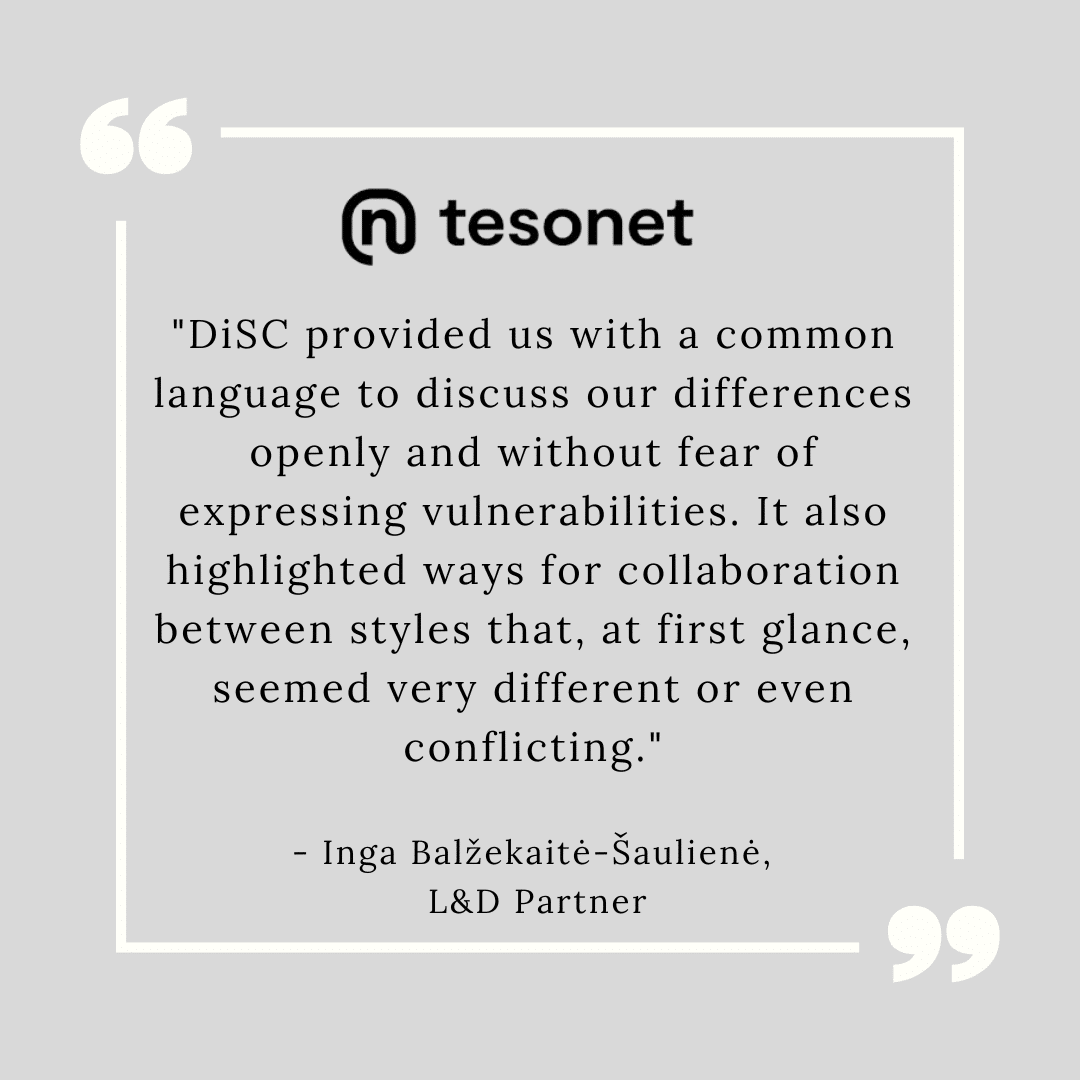 Tesonet’s Learning & Development Partner enrolled in the DiSC Certification program, enabling them to facilitate DiSC-based learning sessions internally. Since then, DiSC has become a cornerstone of their L&D strategy across three areas: